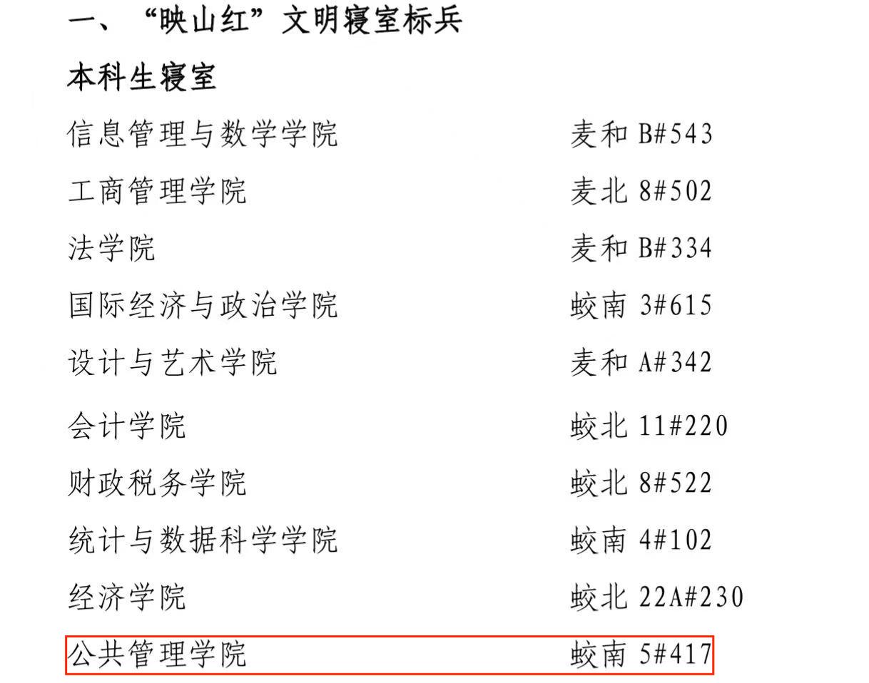 以下寝室凭借整洁雅致的内务环境、团结互助的同窗情谊、遵规守纪的自律意识和积极向上的精神风貌,共成功斩获7个本科生与6个研究生“映山红”文明寝室荣誉称号。其中本科生寝室(蛟南5#417)与研究生寝室(蛟北研A#710)获评“映山红”文明寝室标兵荣誉称号。